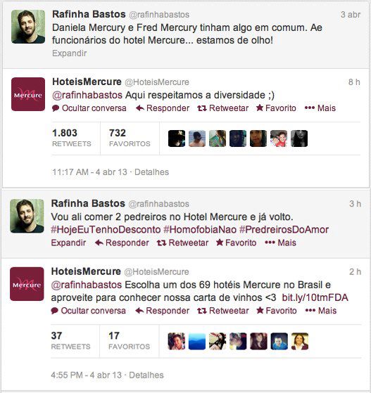 Gostaria de aplaudir de pé o marketing digital dos Hotéis Mercure pelas respostas dadas ao humorista Rafinha Bastos. Para quem não viu a mais nova confusão criada pelo ex-CQC, o humorista fez uma piada com Daniela Mercury (que recentemente assumiu seu relacionamento com uma mulher), Fred Mercury e a rede de hotéis através do Twitter.
