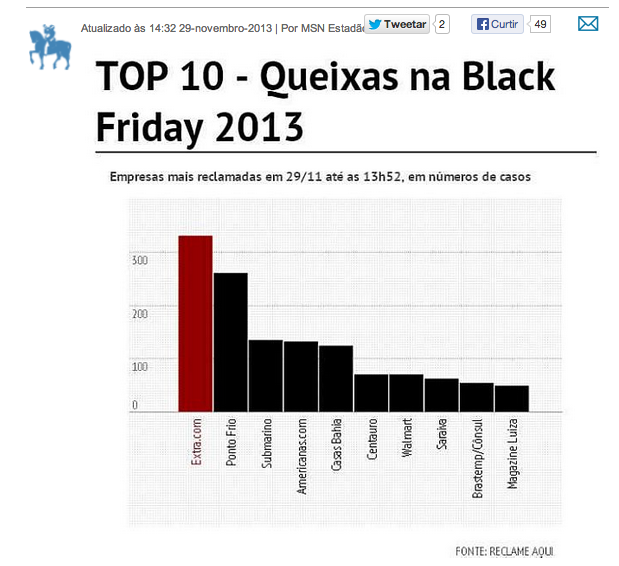 “Apesar das 8,5 mil reclamações, a Black Friday Brasil 2013, realizada na última sexta-feira (29), movimentou R$ 424 milhões no e-commerce brasileiro. O montante é 95% superior ao registrado na mesma data do ano passado, quando as lojas faturaram cerca de R$ 217 milhões. A previsão do Busca Descontos, que organiza o evento, era de uma movimentação de R$ 340 milhões. Os dados são da ClearSale, que oferece soluções para lojas virtuais.