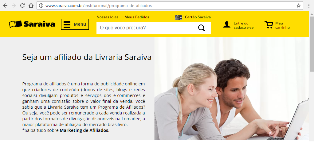 Role para baixo e clique no botão “Seja um afiliado Saraiva, cadastre-se!”.